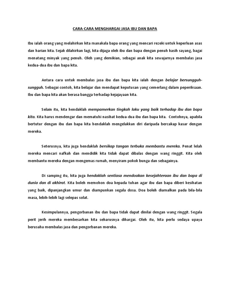 Bapa kita akan berasa bangga terhadap kejajayaan kita. Cara cara menghormati jasa ibu bapa pdf. Karangan ini sesuai bagi soalan karangan yang 350 patah perkataan punya.